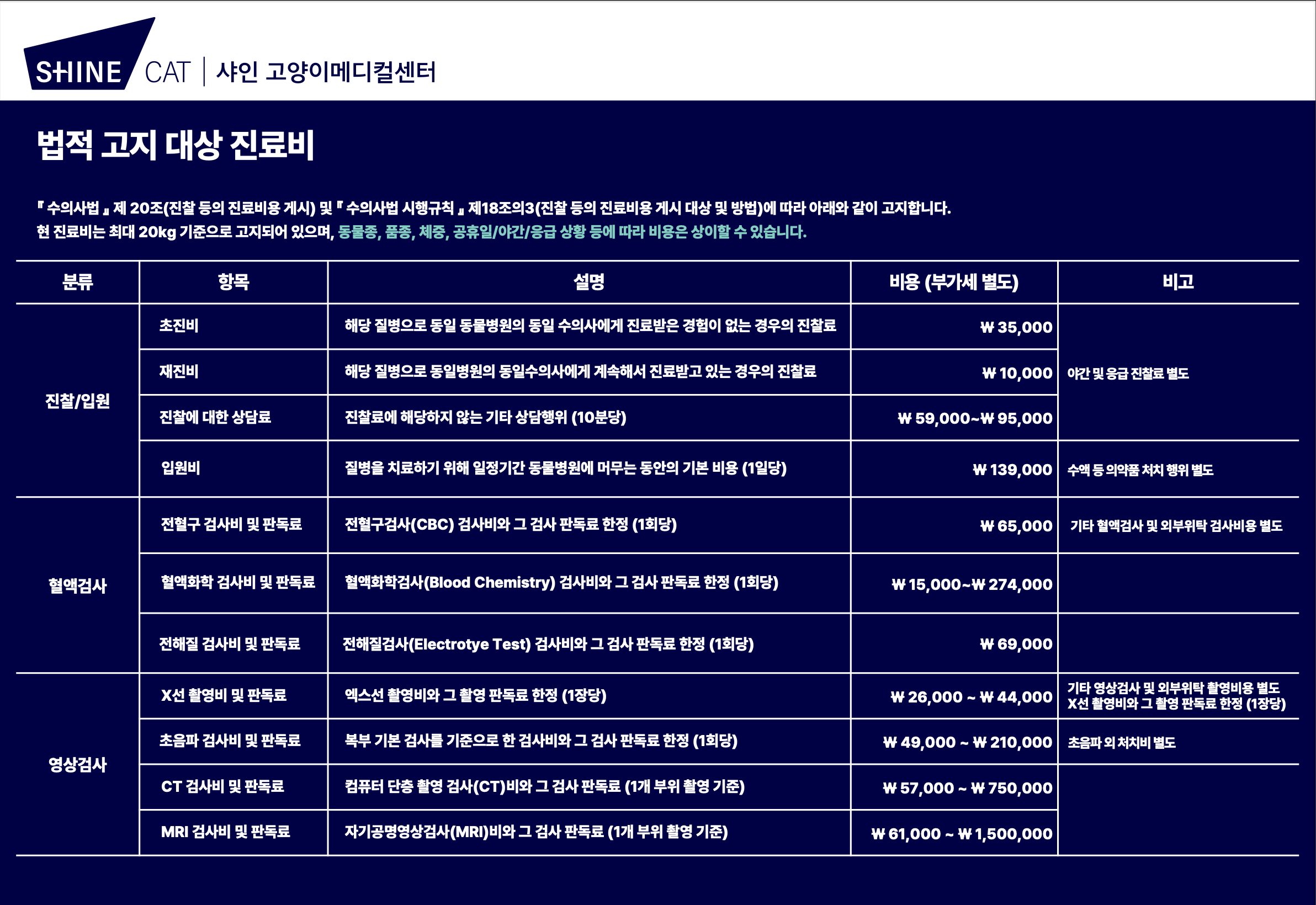 [수의사법] 제20조 (진찰 등의 진료비용 게시) 및 [수의사법 시행규칙] 제18조의3(진찰 등의 진료비용 게시 대상 및 방법)에 따라 아래와 같이 고지합니다.